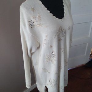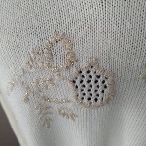 Vintage collector 100% cotton sweater from LizWear. This festive piece is oversized and embroidered with gold pine cones and holly.
