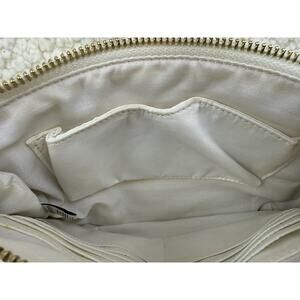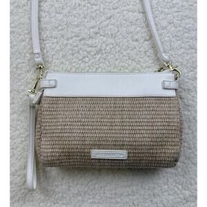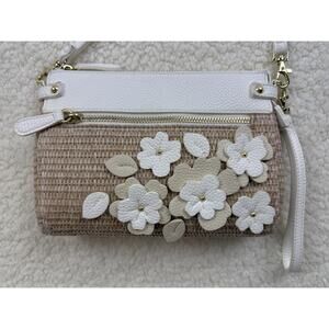Liz Claiborne Crossbody Purse White Tan Tea Rose Appliqué Wicker Straw Handbag