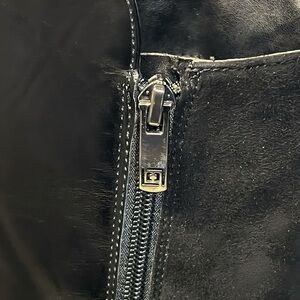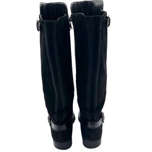 Classic and versatile, these Liz Claiborne Dallas knee-high riding boots feature a tall sleek faux leather and suede design with silvertone buckle accents and a comfortable memory foam footbed. They include dual stretch panels along the back for added calf room and a full side zip for easy wear. Excellent preowned condition with light creasing on the uppers and a few tiny scuffs on the left toe—both barely noticeable. See photos.