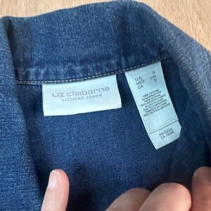 Classic Liz Claiborne denim jacket in medium blue wash. Features a zip front closure, pointed collar, and front welt pockets for a clean, structured look. A versatile layering piece that pairs well with casual or dressy outfits.
