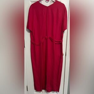 This Vintage Women’s “Liz Claiborne Dresses” is a size 16 Long Dress. This dress is a Fuchsia or a hot pink color. It has buttons down the front. There are front pockets and kind of a drawstring belt. It is made of 55% Linen and 45% Rayon. Dry Clean only.