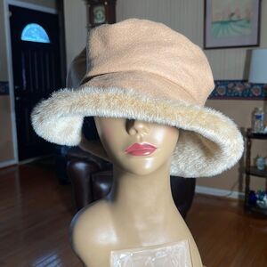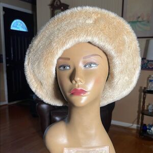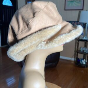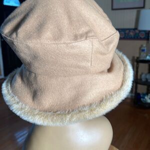 This elegant very versatile cream faux fur hat adds a touch of luxury to any outfit. 65% wool and 35% rayon at top of hat. NWT. Perfect for keeping warm while looking stylish.