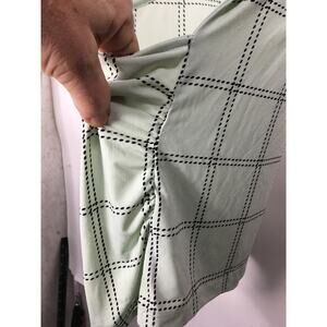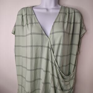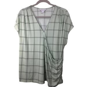 Liz Claiborne Faux Wrap Top Short Sleeves Green Women's Size XL. Mint green with a black dash/line large check print. Wrap look but sewn at the side and tacked at the V-neck. Soft very stretchy fabric.