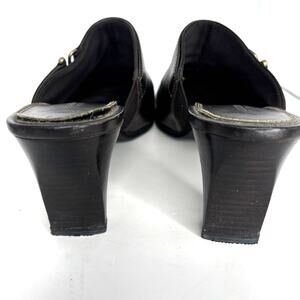 These Liz Claiborne Flex mules are the perfect blend of style and comfort, featuring a rich dark brown leather upper with a sleek buckle detail. The 3" wooden heels add a touch of sophistication, making these versatile mules ideal for work, casual outings, or dressier occasions.