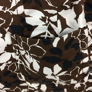 Brown with Black and White Floral design, 2 open pockets, button closure, collared, shorter style