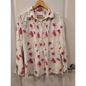 Liz Claiborne Pleated Linen Blouse with pink flowers and roll tab sleeve