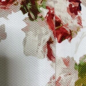 Beautiful dress by Liz Claiborne. White sheath dress with a floral print in shades of red, pink, green, etc. Two front pockets. Cap sleeves. Fabric has a texture similar to a waffle weave or canvas but soft and not stiff. Back center invisible zipper closure. Lined. So pretty! All measurements are approximate, taken flat and closed.
