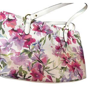 This tote bag is spacious and stylish, featuring an elegant floral pattern. Its white straps and gold accents add sophistication and charm.