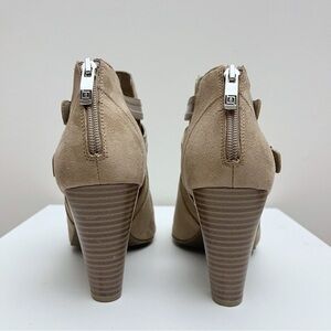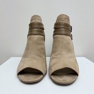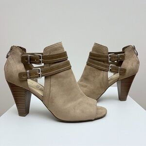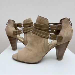 Liz Claiborne Genesis Tan Brown Buckled Strappy Peep Toe Block Heels