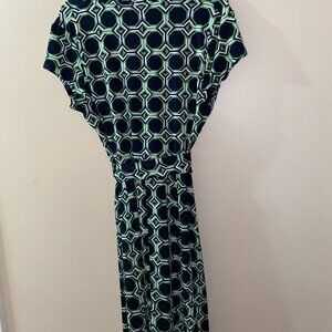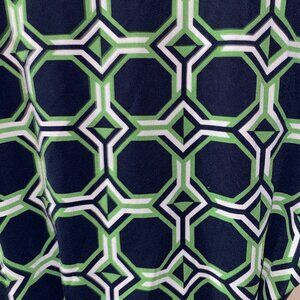 Chic midi dress with geometric design. Features navy and green colors. Ideal for versatile wear.