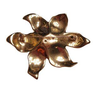 Founded in 1976 in New York, Liz Claiborne Inc. was named after the famous American designer Anne Elisabeth Jane Claiborne, who also became a part of the founders. The company immediately became successful. In 2006, the company’s turnover amounted to more than 5 billion dollars. Liz Claiborne Inc. became the first woman-based company to be on the prestigious list of the most successful Fortune 500 companies. This flower brooch features intricately made details set in gold-tone base metal, green enamel studded with green rhinestones on the petal's edges, and lucite beads at the center. Signed LC at the back. The pin functions properly and is in good vintage condition.