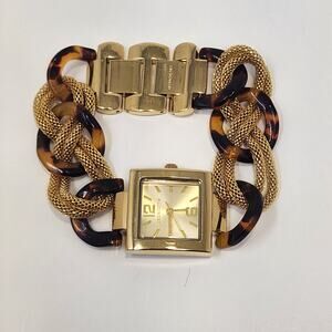 Liz Claiborne watch wristwatch, gold tone metal mesh and tortoise shell print acrylic chain link bracelet style, square gold tone metal face, number and dash markers, seconds hand, foldover clasp closure. Signed Fashion Costume Accessory Casual Workwear Lightweight