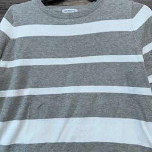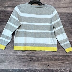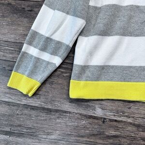 This casual and comfortable sweater features a classic striped design with alternating gray and white stripes, complemented by a bright yellow band at the bottom. It has long sleeves and a crew neck style, making it a versatile addition to any wardrobe.