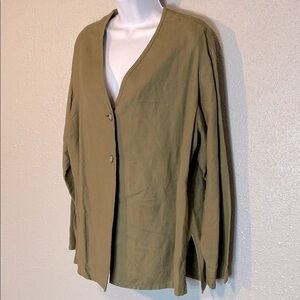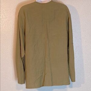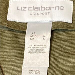 This Liz Claiborne blazer in a muted green hue offers a relaxed, unstructured silhouette perfect for layering. Crafted from a soft, comfortable material, it provides a versatile addition to any wardrobe. Excellent condition. Size large. Pit to pit 23”. Shoulder to hem 29.5”.