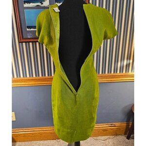 This Liz Claiborne green linen dress is a size 6, designed with short sleeves and a pleated style. The dress features a back zipper for easy wearing. Its high-quality material makes it perfect for casual business wear.