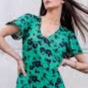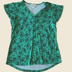 Features: Green blouse with navy blue blossom print. V neck button front details. Flutter sleeves. High low hem.