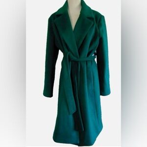 Elegant green trench coat. Features a belted waist, pockets on sides.