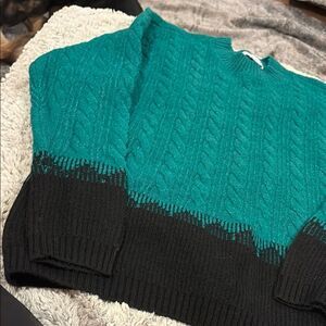 This Liz Claiborne sweater showcases a bold two-tone design with a vibrant green top and solid black bottom. The classic crewneck style is enhanced by a cable knit pattern, offering both texture and warmth for chilly days.