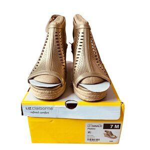 NWT Liz Claiborne Hanalei Gold Laser Cutout Wedge Sandals Sz 7M. Stylish and fashion forward sandals with jute rope details. Color Platino - Platinum. Man made materials. Cushion footbed. Espadrille style. Rubber outsole. Heel height 3" and platform height 1.68". Item in NWT condition. No known rips, tears, holes, stains or defects. Comes with the original box.