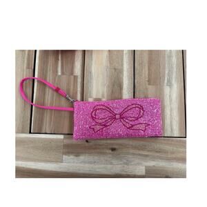 Liz Claiborne Hot Pink Satin Clutch – Beaded Bow, Barbiecore Wristlet, Coquette