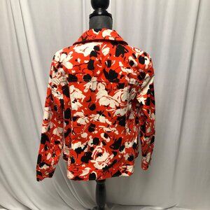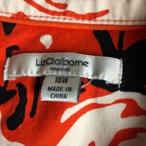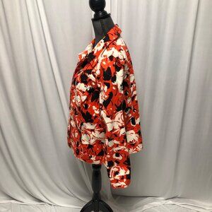 This Liz Claiborne Jacket is a vibrant blend of orange, black, and white floral designs. It's a women's size 18W featuring long sleeves and a comfortable cotton-spandex blend.