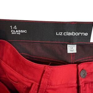 Liz Claiborne Jeans Women's 14 Red Denim Flex-Fit Classic Slim Skinny Leg Zip Fly. Pants measure 36x31 inches. Please see photos for measurements.