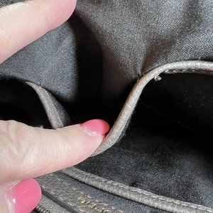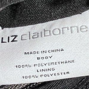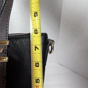 Liz Claiborne Kelsey Mini Tote 7.5" Tall Black & Grey. Long strap has been removed, but can be reattached. Very clean small bag with several interior pockets including one zippered pocket. One outside pocket. Zip closure at top of bag. Fabric liner. In some lights, this bag looks brown to me.