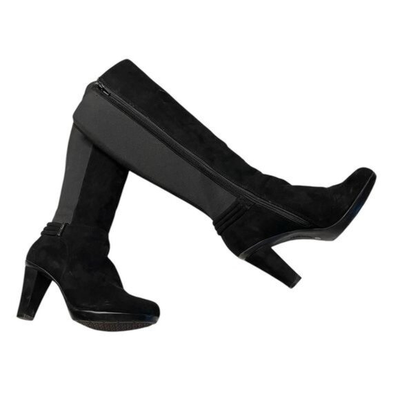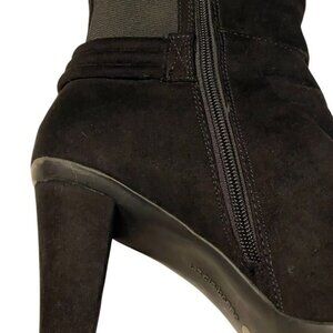 These Liz Claiborne LC Singer Knee High Boots in black feature a round toe, high cone heel, and zipper closure. They are made of faux suede with a medium calf width and adjustable fit. Ideal for parties, casual or formal events in fall, winter, or spring. The boots are comfortable and stylish, with a rubber outsole for durability.