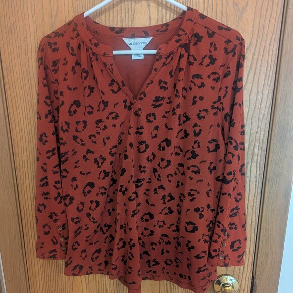 Liz Claiborne Leopard Print 3/4 Sleeve V-Neck Pullover Top Terracotta-Large