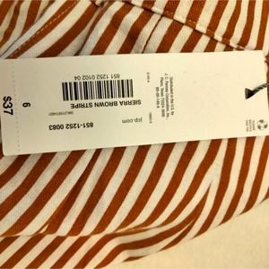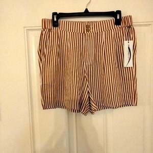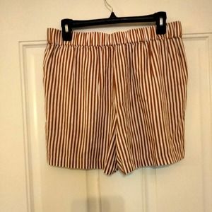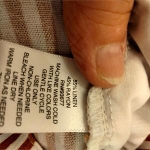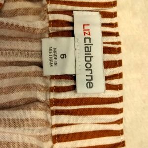 linen and rayon. zip front. 2 side pockets. elastic back waist. white with light brown stripes. 5" inseam. size 6. light and comfortable.