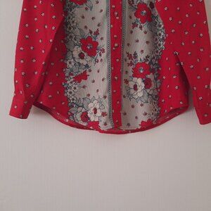 Beautiful Blouse Red Navy Cream Floral Striped Pattern. Button Front Closure and button cuffs. (Additional Button attached) - Shirttail hem