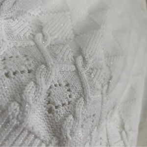 Solid white knit embellished short sleeve sweater pullover top featuring metallic sparkle detail fabric, diamond argyle cable knit woven stitching throughout giving different textures, ribbed cuffs n hem with a ribbed round neckline in size medium (tag has been removed pls see measurements). This unique beaded rhinestone appliqué sweater is in excellent pre owned condition.