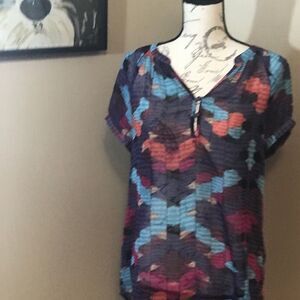 Liz Claiborne size medium short sleeve geometric blouse. It can be worn casually with jeans or dressed up for business. Made of 100% polyester, this hi-low blouse measures 25 inches in the front length, 29 inches in the back length, and 21 inches pit to pit. P1 B239