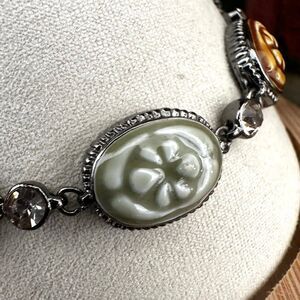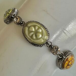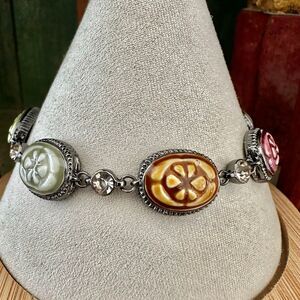 Charming vintage Liz Claiborne bracelet featuring oval cabochons in cheerful pastel tones โ soft pink, yellow, ivory, and olive โ each with a raised floral design. Sparkling clear rhinestones accent each link, adding a touch of shimmer and elegance. Set in silver-tone metal with a classic fold-over clasp.
