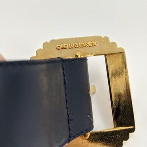 Vintage 1987 Navy leather belt with large gold buckle by Liz Claiborne. Good vintage condition, any flaws shown in pics. Marked a size Medium, could also fit a Small but please check measurements below.