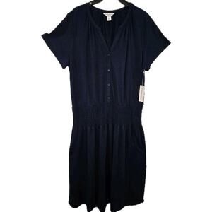 Liz Claiborne Navy Blue Smocked Waist Button Front Midi Sundress Casual XXL