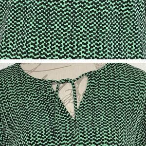This Liz Claiborne top blouse in size medium features a classic round neck with a tie closure and 3/4 sleeves, making it suitable for various occasions like travel, workwear, or casual outings. The blouse is crafted from a blend of polyester and spandex in a knit fabric, offering a comfortable and stretchy fit. The navy and green color combination, along with tasseled and studded accents, adds a colorful and stylish touch to the piece, perfect for the summer, fall, or spring seasons. This beautifully stunning blouse is from a smoke free but doggy friendly home. We always entertain reasonable offers!!!! Happy Shopping!!