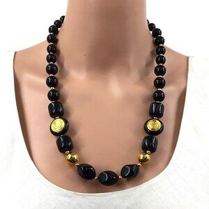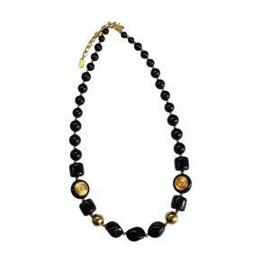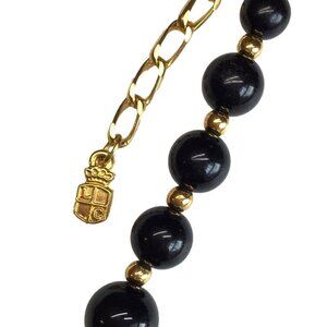 Liz Claiborne Necklace Black Gold Tone Beads Crest Shield Adjustable Length