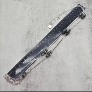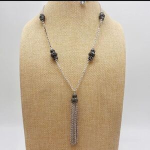 At the center of the necklace is a tassel pendant composed of fine silver-tone chains, providing a chic and playful accent. The tassel is attached to the chain with a bead cap that matches the decorative beads on the necklace, creating a cohesive look. This versatile piece is ideal for both casual and formal outfits, offering a modern and sophisticated touch. It is new without tags (NWOT) and ready to enhance your jewelry collection.