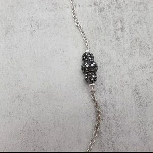 This is a Liz Claiborne silver-tone necklace with a stylish and contemporary design. Measuring 26 inches in length, the necklace features a series of black bead stations evenly spaced along a delicate silver-tone chain. The beads have a textured and faceted appearance, adding a touch of elegance and sparkle to the overall design.