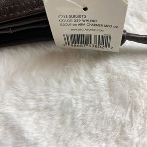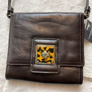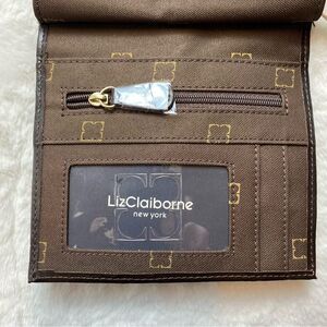 Liz Claiborne New With Tags Brown Leather Crossbody Purse. Excellent new condition. Front turn clasp opening. Tri-fold with ID/card slots and zipper compartment. Front leopard print acrylic accent. Long strap with 24" drop, removable. Back snap pocket. Measures approximately 5.5"x5".