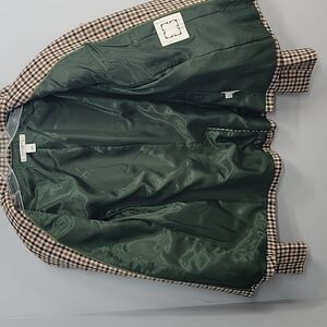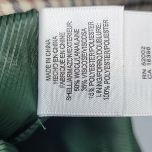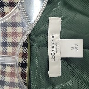 Liz Claiborne blazer jacket size 12. New without tags. Back vent still seamed. Flap pockets. Lined in green. 3 button closure. 4 button cuffs. Notch collar. Wool blend