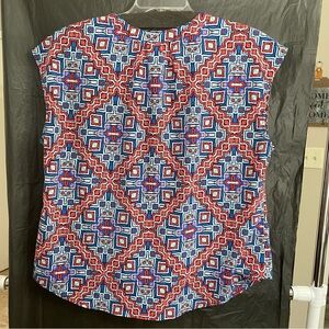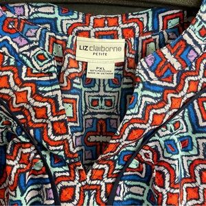 This Liz Claiborne blouse showcases a striking red and white color scheme, designed with a boxy silhouette for a modern look. The mandarin collar adds a touch of elegance, making it a versatile piece for both casual and formal occasions. Its lightweight fabric ensures comfort and breathability throughout the day. No visible flaws…excellent preowned condition. Approximate measurements below:
