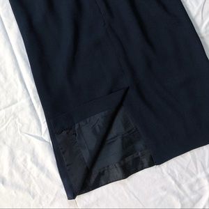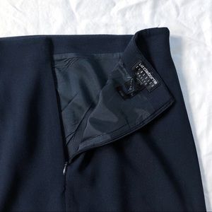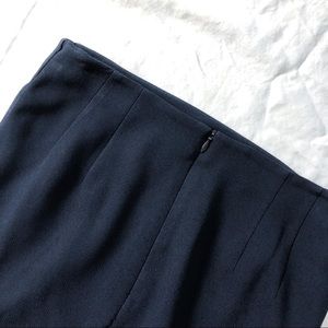 Navy blue knee length classic business professional skirt with hidden zipper in back. Straight fit with back slit