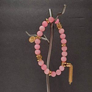Brand new stunning Liz Claiborne stretchy bracelet with real pink semi-precious gemstones (rose quartz), gold tone and rhinestone beads, and gold tone tassel. New in original box, never worn. One size (stretchy).
