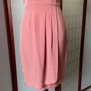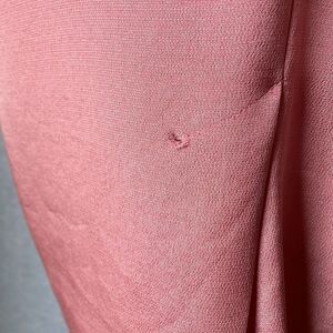 Rose colored dress with short sleeves and embroidered design along the neck and zipper in the back. Small slit on the bottom of back of the dress. There is a tiny hole in the back on the bottom. But, not other flaws.