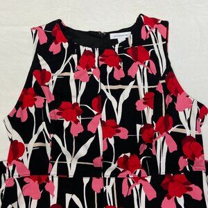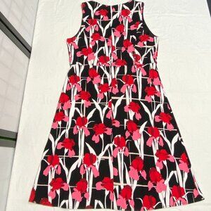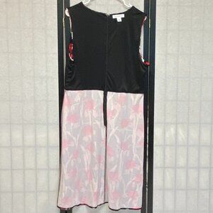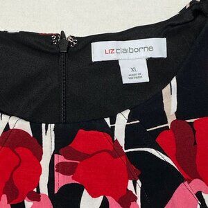 Sleeveless Princess Fitted Bodice A Line Knit Dress from Liz Claiborne. Lovingly worn – looks in excellent used condition. A line silhouette in stretchy mid weight white, black, red and pink all over swirl floral knit design. Scoop neck in front with higher neckline back. Delicate pleat neckline for more controlled fit. Topstitched princess seams front and back to waist seam. Center front seam continues to hemline. Bodice lined in solid black stretch knit. Invisible zipper in back. Hits just below the knee. Pair with heels and statement jewelry for a polished look or flats and a cardigan for effortless elegance.