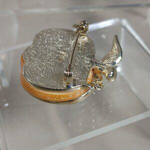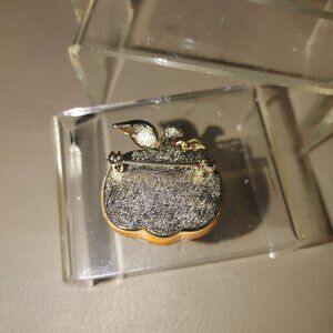 Liz Claiborne Pumpkin Brooch Pin Vintage Gold Tone MOP Mosaic Green Leaf Accent