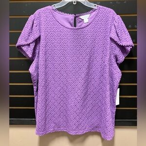 This relaxed, boxy blouse from Liz Claiborne features a rich purple hue, offering a stylish and comfortable fit. The blouse is designed with a classic round neckline and short sleeves, making it a versatile addition to any wardrobe. Its soft fabric and subtle sheen add a touch of elegance to its casual style.