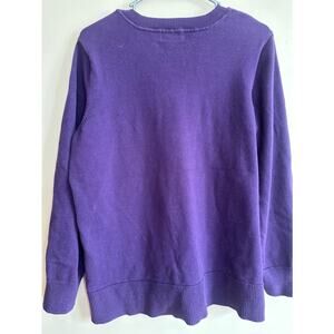 Liz Claiborne women’s purple V-neck knit sweater featuring a bold chevron stripe pattern across the front. Soft cotton knit with ribbed neckline, cuffs, and hem. Classic, flattering fit that works great for work or casual wear.